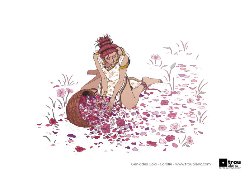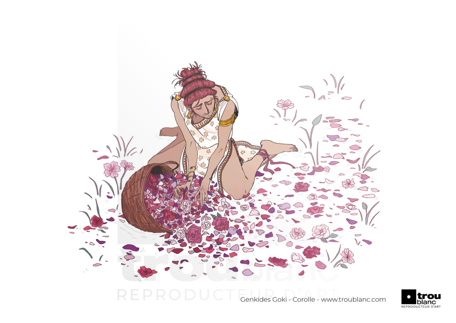 Inspiré par des peintures de la Grèce antique. Malyo ramasse des corolles de fleurs tombées de son panier au sol, perdus dans ses pensées.