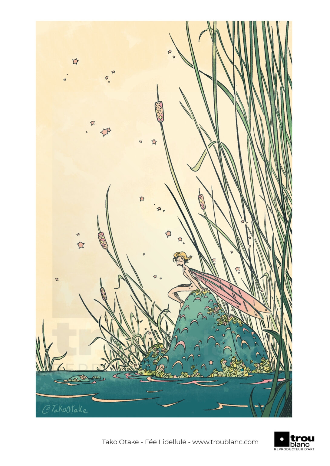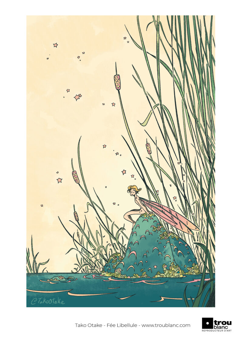 Tout l'univers de Tako OtakeAu bord de l’eau, une petite fée libellule se repose. Un être heureux, souriant à cette nouvelle journée pleine de magie. Joncs et roches moussus, qui sait quelles autres créatures se cachent autour de nos rivages.
