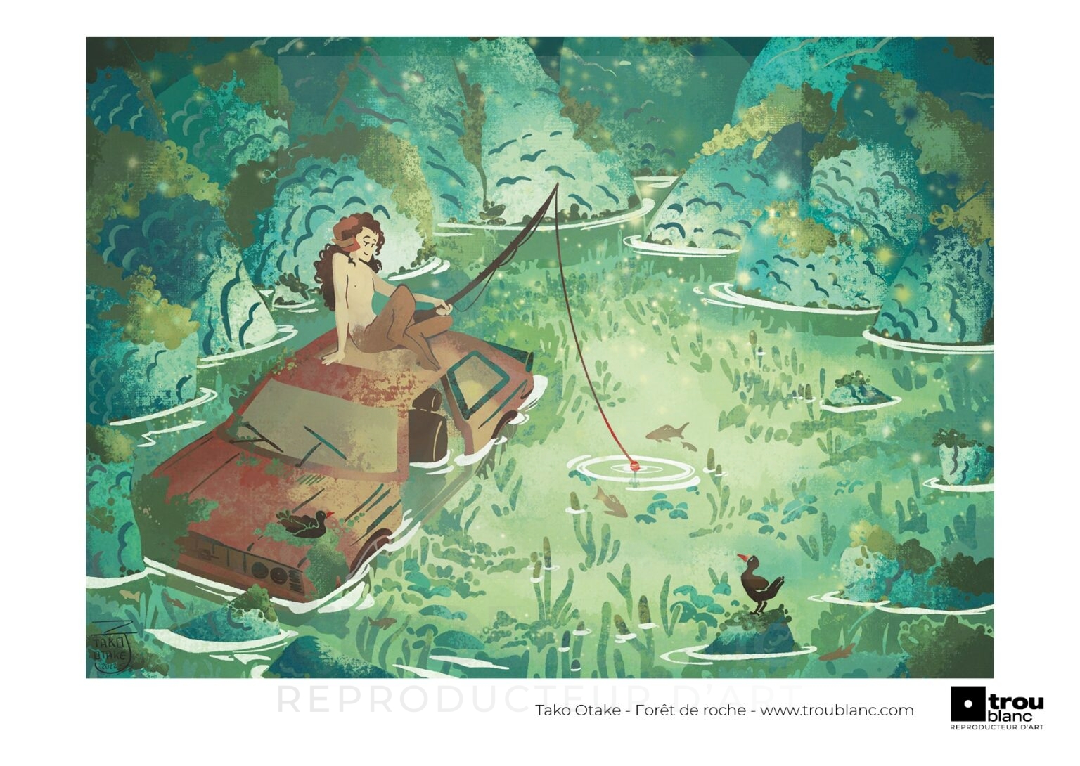 Tout l'univers de Tako OtakeL’idée était d’illustrer ce qui me plaisait en ce moment, ce qui vibrait. Ainsi sont réapparues les roches moussus, l’eau transparente au cœurs d’une forêt de pierre, gardée par quelques poules d’eau, où le temps s’allonge et le calme régne.