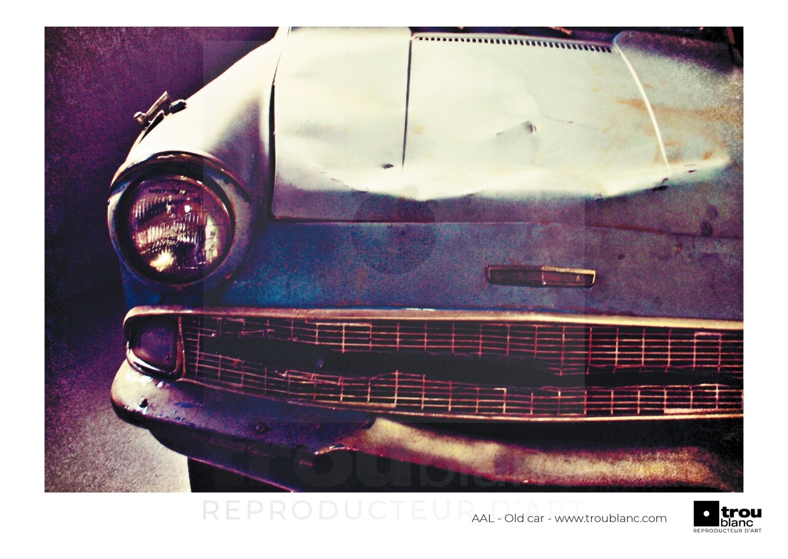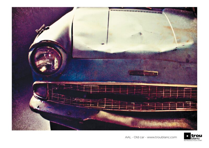 Photo à l’aspect vintage d’une vielle voiture américaine dont le bleu se mêle au gris de l’arrière plan.