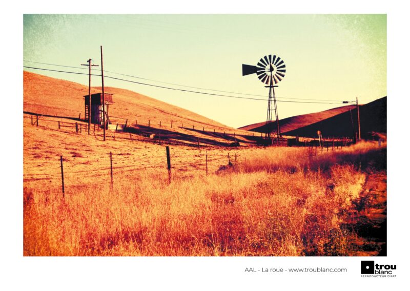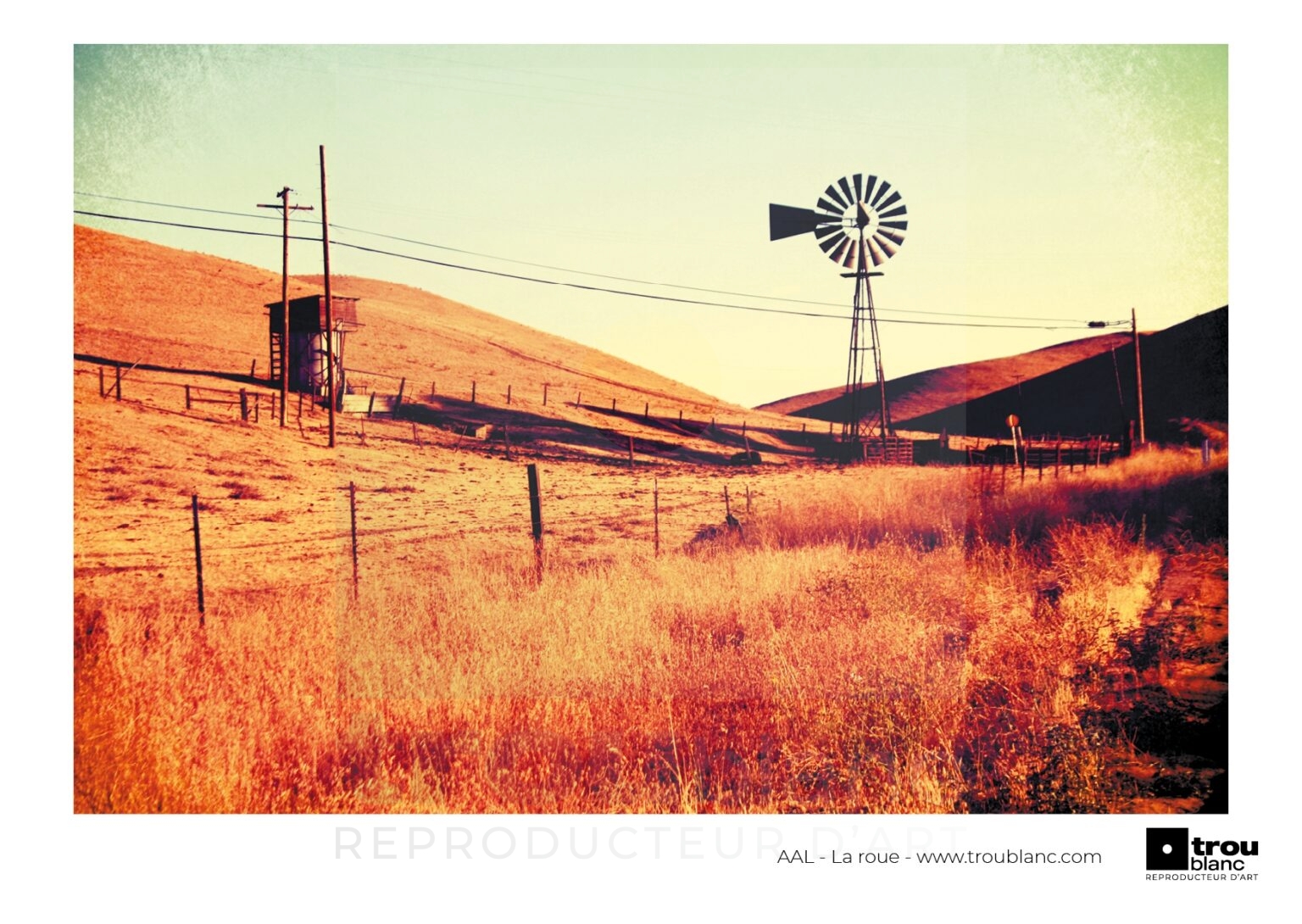 Photo vintage d’un vieux moulin planté parmi les collines grillées par le soleil californien.