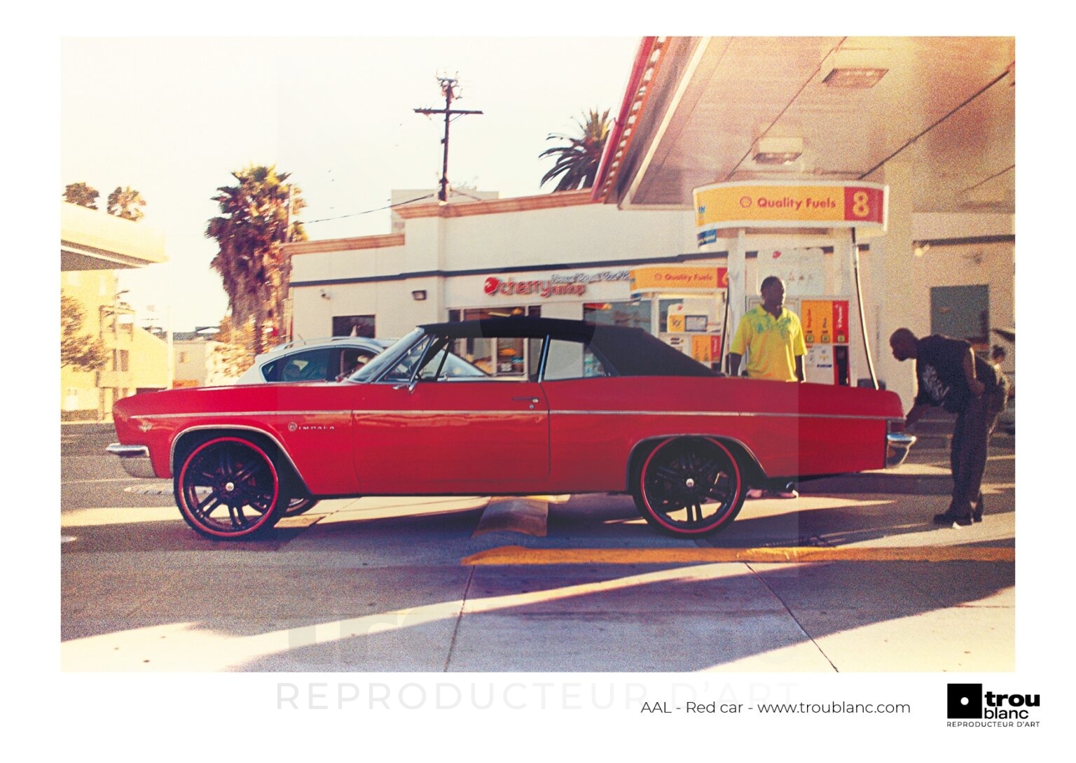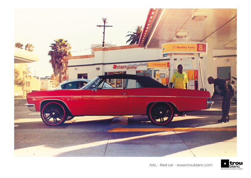 Photo vintage d’une voiture rouge rétro. Station d’essence à Los Angeles.