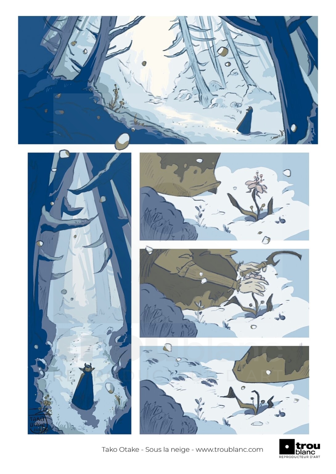 Tout l'univers de Tako OtakeCette planche de Bande Dessinée, entièrement réalisée au digital, est une invitation vers une longue ballade. Le silence de la neige épouse les flocons tombant dans une forêt endormie. Seul quelques fleurs émergent en ce long hiver, nourrissant celles et ceux qui restent éveillés.
