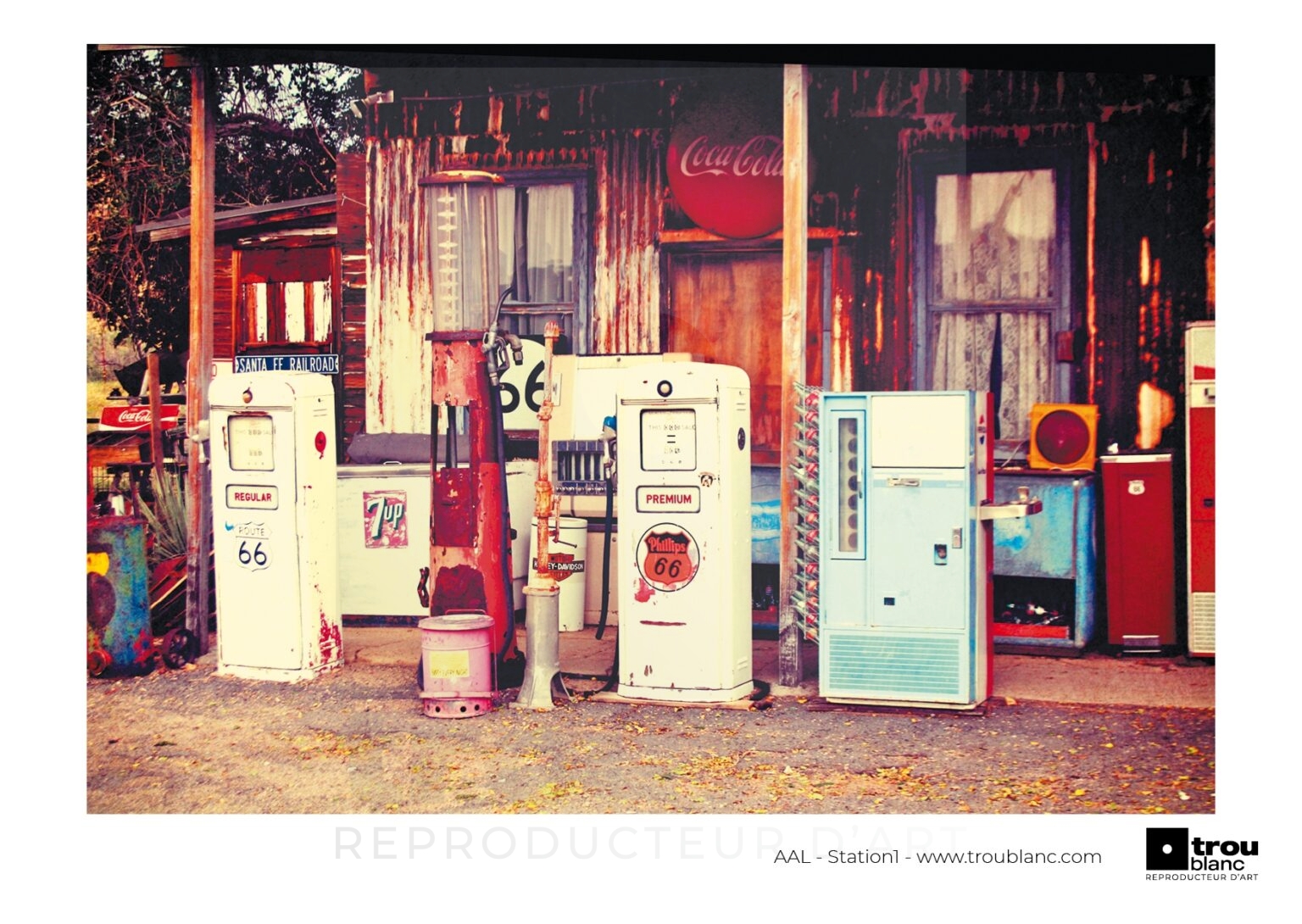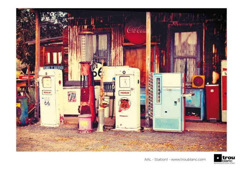 Photo à l’aspect vintage d’une vieille station d’essence sur la Route 66, dans l’Arizona.