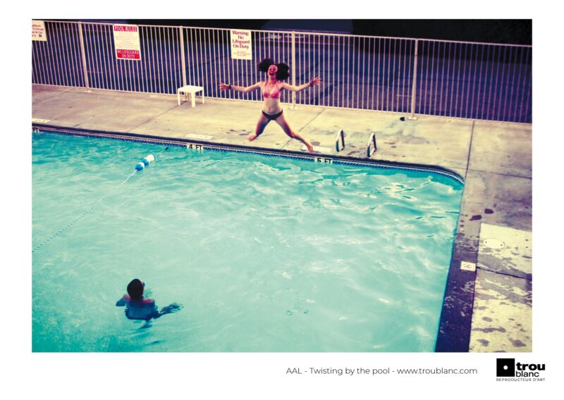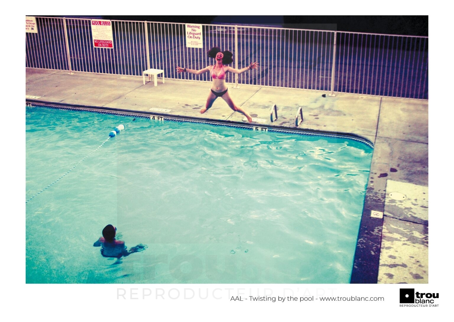 Photo vintage d’une jeune fille sautant dans la piscine d’un Motel dans l’Ouest américain.