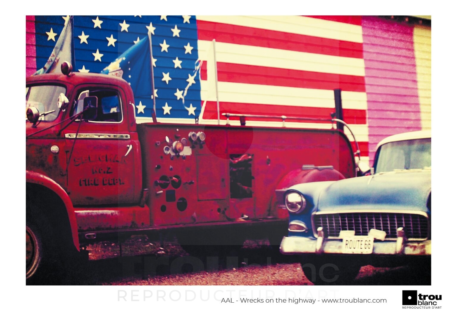 Photo vintage d’une carcasse d’anciennes voitures avec en arrière-plan le drapeau américain peint sur un mur en bois
